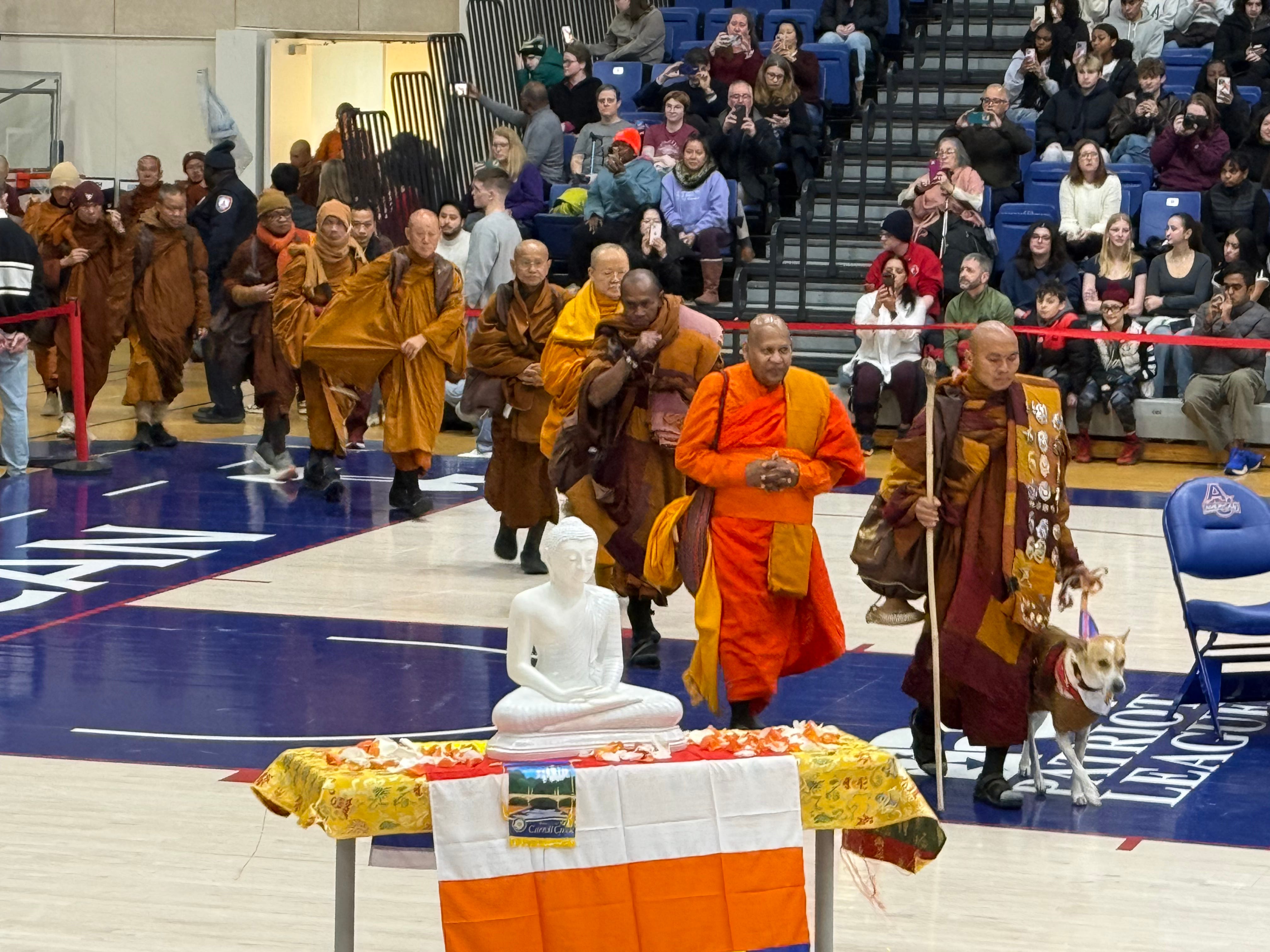 Thousands of us packed our nervous systems into the school’s basketball arena to watch in silence as 19 monks wearing saffron and maroons robes padded in. Some of the monks had walked barefoot throughout the journey from Fort Worth. One lost his leg in November when the vehicle accompanying them was hit by a truck. He rejoined the sojourn in a wheelchair in early January and rolled into the arena Tuesday with the rest of his crew.